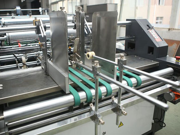 上胶部 上胶部采用伺服控制,单独控制上胶部, 采用可调式局部上胶结构,依据纸制品要求 上胶量及上胶位置能够方便调节,节省胶量 上胶部方便拉出,清洗方便,上胶辊在停机 或缺张情况下自动上升停止上胶。停机时, 输纸部自动下沉,胶水不易印在输送带上 |